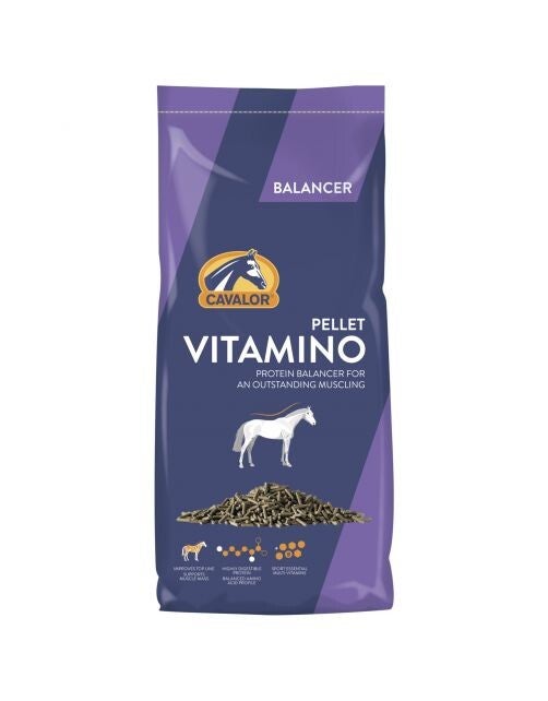 Cavalor VitAmino is een eiwitbalancer voor een uitstekende bespiering en bovenlijn. Deze balancer is een bron van kwalitatieve eiwitten die door hun hoge verteerbaarheid en specifiek aminozuurprofiel optimaal bijdragen aan de ontwikkeling van meer spiermassa. Bij de aanmaak van spieren is het belangrijk dat paarden over voldoende bouwstoffen, waaronder bepaalde aminozuren, beschikken. Cavalor VitAmino bevat soja, luzerne en aardappeleiwit die alle essentiële aminozuren in de juiste verhouding bevatten zodat zo efficiënt mogelijk een sterke bespiering wordt bekomen. Bevat vitamines, sporenelementen en mineralen om het nutritionele evenwicht van het rantsoen te behouden. Cavalor VitAmino ondersteunt spierbehoud en helpt bij de spieropbouw van je paard. Het eiwit waar spieren uit opgebouwd zijn, is een keten van aaneengeschakelde aminozuren. Voor de opbouw van spiermassa is naast voldoende bouwstoffen, die het paard haalt uit kwalitatief eiwit dat verteerd wordt in de dunne darm, ook voldoende energie nodig om het proces te laten doorgaan. Naast de juiste voeding is een aangepast bewegingsschema essentieel voor spierbehoud en -ontwikkeling. Tijdens inspanningen vindt er namelijk spierafbraak plaats. Er ontstaan kleine scheurtjes in de spiervezels. Dit triggert het lichaam om nieuwe spiervezels aan te maken. Cavalor VitAmino levert de benodigde aminozuren zodat samen met inspanning spierherstel en spieropbouw kan plaatsvinden. Belangrijker dan het gehalte eiwit, is het gehalte verteerbaar eiwit. Zo is het eiwit in soja voor 50-80 % verteerbaar, terwijl dat in hooi een heel pak lager ligt. Hoe beter verteerbaar het eiwit is, hoe minder eiwit nodig is om over voldoende aminozuren te beschikken. Cavalor VitAmino bevat goed verteerbare eiwitbronnen waaronder soja, aardappeleiwit, luzerne en tarwevoermeel waardoor het totale gehalte eiwit beperkt kan blijven. De specifieke samenstelling van Cavalor VitAmino biedt een aminozuurprofiel dat zeer gelijkaardig is aan dat van het spiereiwit van het paard. De hoeveelheid van elk en de juiste onderlinge verhouding (aminozuren profiel) van deze aminozuren zijn bepalend voor een goede spierontwikkeling. Voor de opbouw van spierweefsel moten alle aminozuren voldoende en in de juiste verhouding voorhanden zijn. Wanneer slechts één aminozuur ontbreekt, wordt het proces van spieropbouw afgeremd. Vitaminen, ze kunnen helpen om net iets meer uit de prestatie te halen. Vitamine E beschermt spiercellen tegen vrije radicalen en ondersteunt de werking van het immuunsysteem. Verschillende vitamines van het B-complex (thiamine, riboflavine, calcium-D-pantothenaat, pyridoxinehydrochloride, choline chloiride, niacine, cyanocobalamine, foliumzuur en biotine) spelen een belangrijke rol in de energievoorziening of dragen bij aan een verbeterd koolhydraatmetabolisme, zenuwoverdracht of aanvoer van zuurstof naar de spieren.